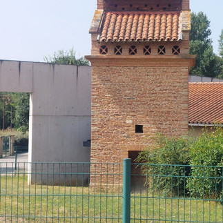 In all the villages, you see many brick buildings; sometimes, all the buildings are red, with red paint over the bricks. In the last village before L'Isle-Jourdain, the town hall is made of red brick, as are the halls, the church, and the cobblestones in front of them.