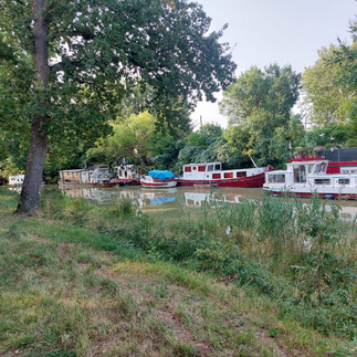 After cycling 40 km in the shade of the (new?) trees and beautiful nature, passing several locks, I reached the outskirts of Toulouse. The closer the canal gets to Toulouse, the more houseboats there are, where people live permanently. The canal runs right through the middle of the city, even next to the Gare Matabiau, the main station. Gradually, I saw more people cycling, alone or with children, etc. It's a real relaxation spot amidst greenery and water. Near the station, I took a short detour to the Basilique St. Sernin, one of the largest Romanesque pilgrimage churches, with a beautiful octagonal tower over the crossing. Built of red brick, like many churches in this area where hard stone was unavailable and too expensive to transport. The Place du Capitole is also worth a visit, along with the many small alleys around it, and the quays of the Garonne with lots of greenery. Toulouse is a pleasant (sometimes too warm) place full of life. Finally, I cycled past the Église des Jacobins, or the Dominican Church, with its palm-tree-like columns fanning out into elegant vaults.