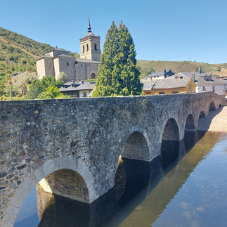 Rond 11 u 30 zet ik de afdaling in. Een bord waarschuwt voor zeer steile hellingen over 15 km naar beneden en het is inderdaad echt uitkijken geblazen. Ik rij aan 10-15 km per uur naar beneden, gebruik makend van mijn schijfremmen, daar waar andere fietsen mij voorbij zoeven. Dat durf ik niet. Na een 10-tal km rij ik door het mooie dorpje El Acebo met zijn rustieke huisjes met balkonnetjes, een echt bergdorpje. Na nog eens 5 km sterk dalen, bereik ik Molinaseca met de Iglesia des Angustias (van de angsten). De vroegere houten deur van de kerk bestaat nu uit metaalplaten. In de middeleeuwen namen de pelgrims splinters mee van die deuren omdat dat goed was tegen alle mogelijke ziekten. Om dat te stoppen heeft men er metaalplaten tegen gezet. Links en rechts zijn aan deze kerk overdekte hallen aangebouwd waar pelgrims mochten slapen. Verder heb je in dat stadje nog de oude brug over de rivier. Aan de andere kant van de rivier ligt de kerk van de Heilige Nikolaas van Bari. Ook daar zijn schilderachtige straatjes met oude huisjes met mooie balkonnetjes. Alles is gebouwd in zware stukken bruinrode rots of leisteen die men vlakbij vindt.