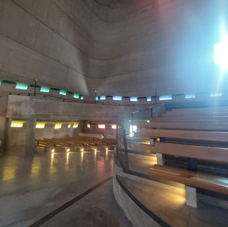 De stad Firminy , ontworpen door Le Corbusier. De piramidale kapel en het interieur